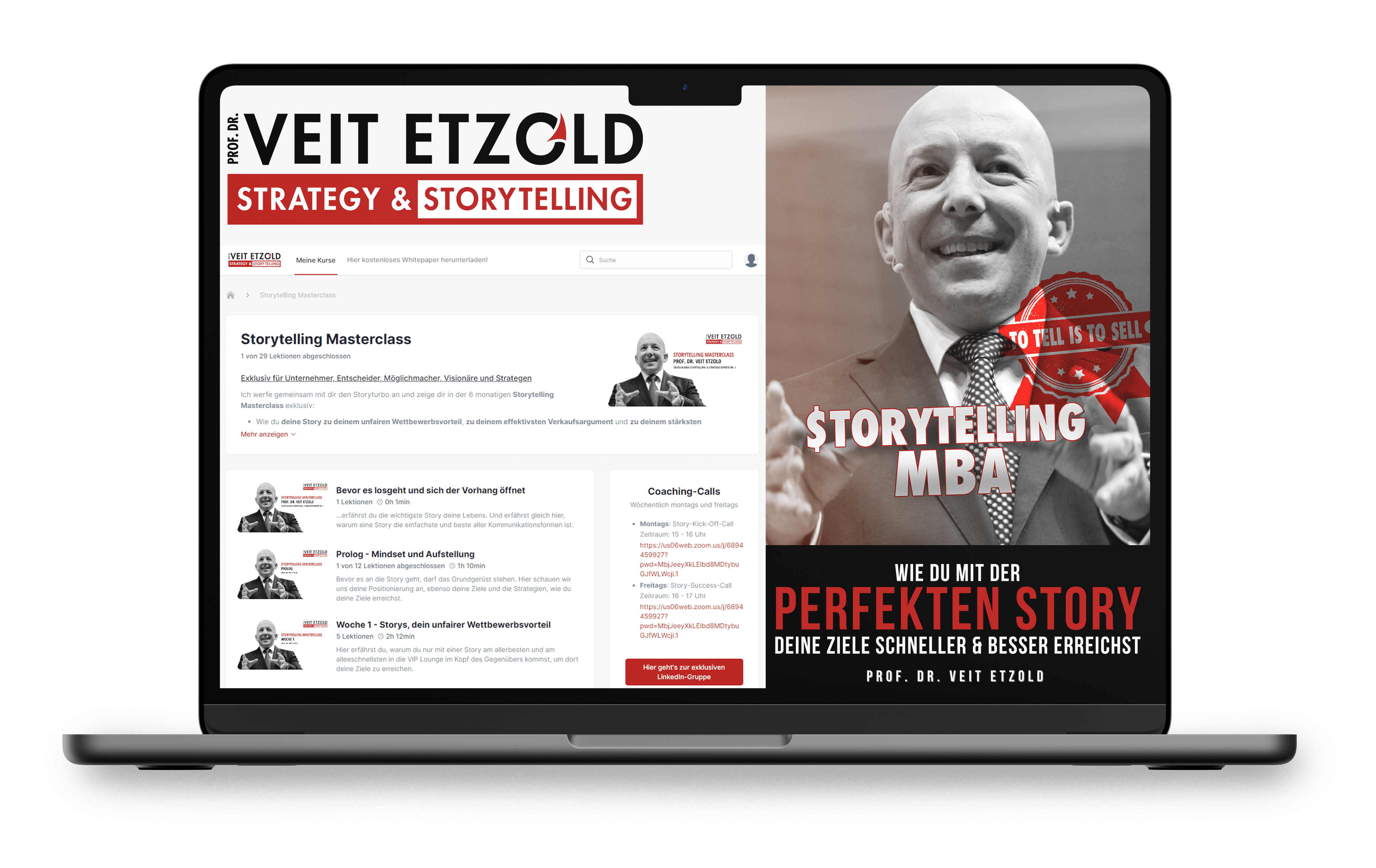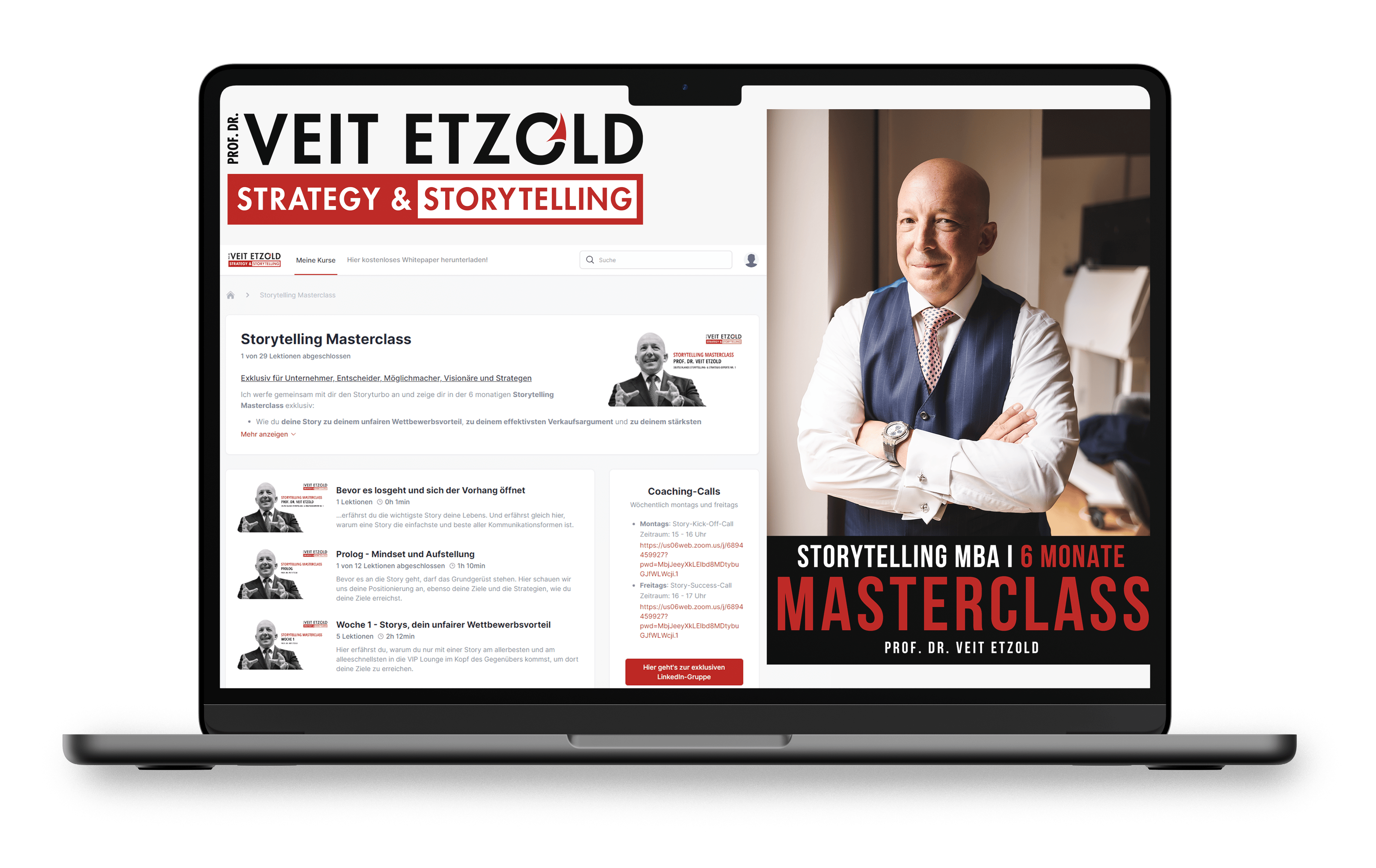 Prof. Dr. Veit Etzold ist Management-Berater, Keynote-Speaker und 12-facher Spiegel Bestseller Autor. Unternehmer, Geschäftsführer und Vorstände lassen sich seit über 10 Jahren von ihm coachen, um mit Storytelling ihr Unternehmen, ihr Produkt und sich selbst bestmöglich zu positionieren und zu vermarkten und um Ihre (strategischen) Ziele noch besser zu erreichen.